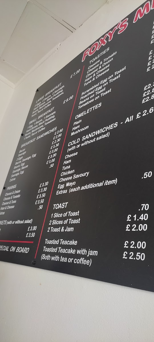 The menu at Foxy's offers a selection of simple, freshly prepared food items suitable for breakfast, light meals, and casual dining. Visitors can expect a focus on classic cafe fare made to order, with options that cater to a range of tastes and preferences.